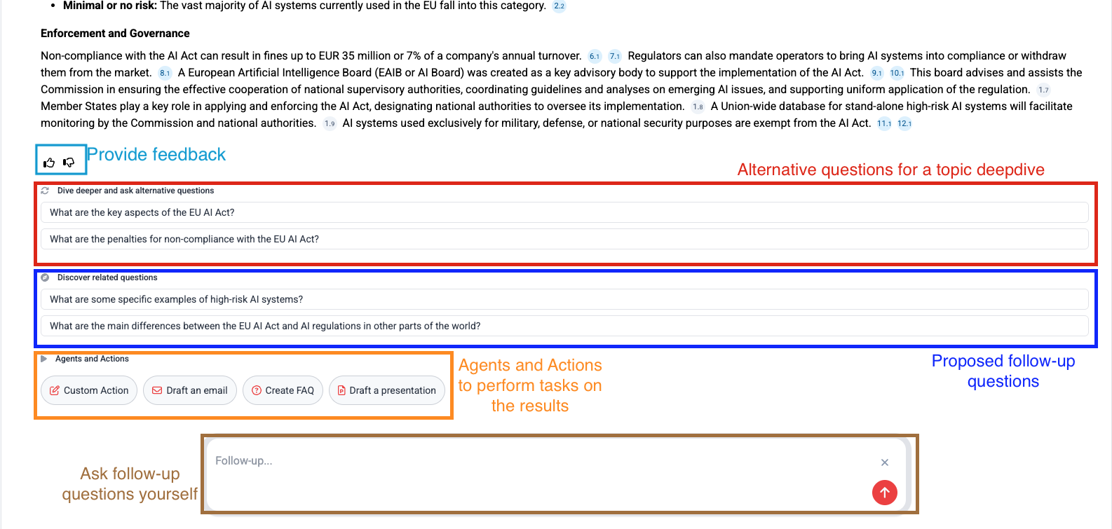 You can ask follow-up questions in the input field below the answer. Please formulate a new question in a new thread for new topics, as the follow-up questions take into account a large proportion of the context from the original questions. This can lead to a bias in the answer for new topics.