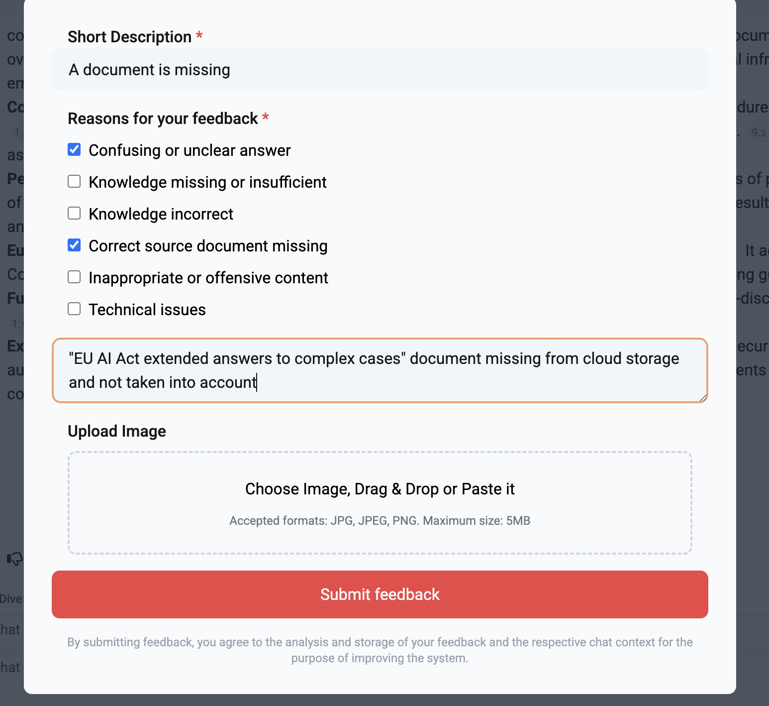 Users can give feedback on individual questions. This is done using the ‘thumbs up’ and ‘thumbs down’ icons (see light blue rectangle in the screenshot above). Clicking on one of the icons opens a feedback form, if this has been set up by the use case admin, in which further information can be added. Users should make sure to provide as much contextual information as possible when submitting feedback.