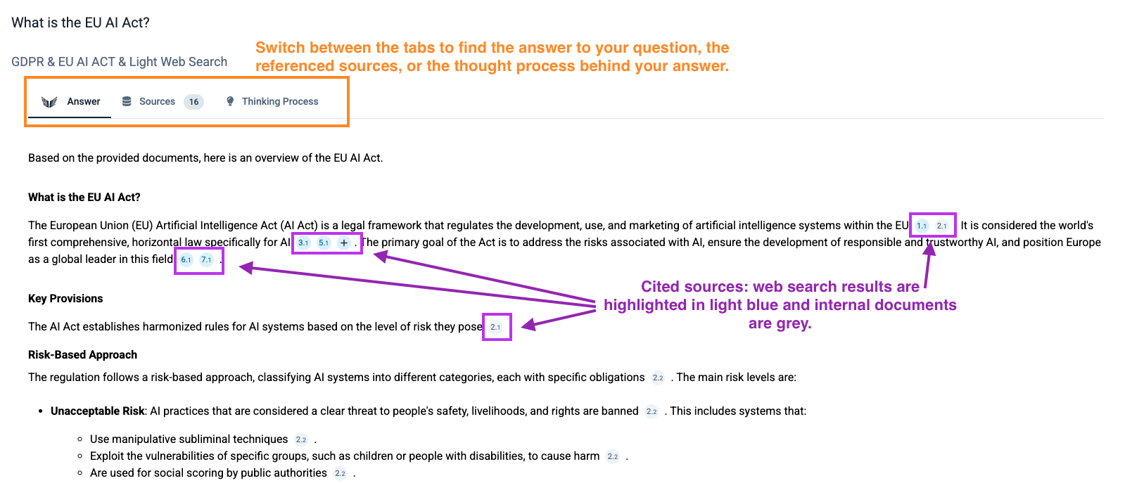 - During the answer generation, the thinking process will be displayed giving the user information about how the search is perfomed.