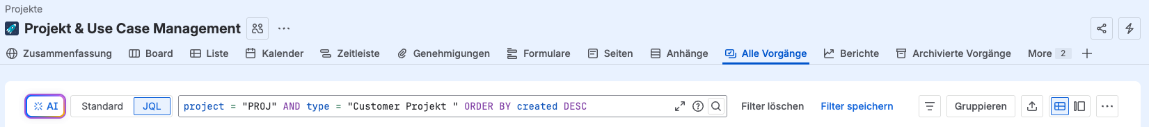 For our Jira connector, you will select your relevant scope using a JQL statement. JQL (Jira Query Language) is a structured search method that allows you to filter and locate specific issues across your Jira projects using precise logical criteria. In Jira, select your project, go to “All Work” (German: Alle Vorgänge), click the Filter-Button on the top left above your list of issues / tasks:- Apply your needed filters to end up with the selection of issues relevant for your use case,