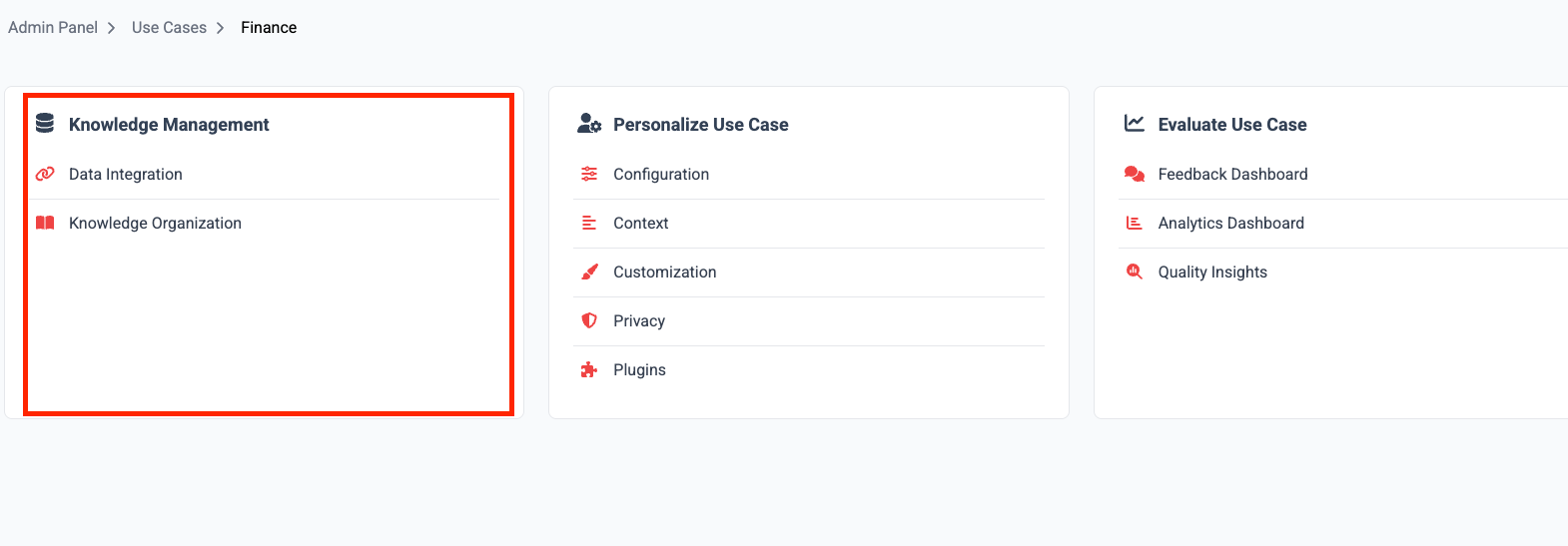 configure. You will find yourself in the use case settings. - You can configure your knowledge sources via Data Integration and your assets via Knowledge Organization.
