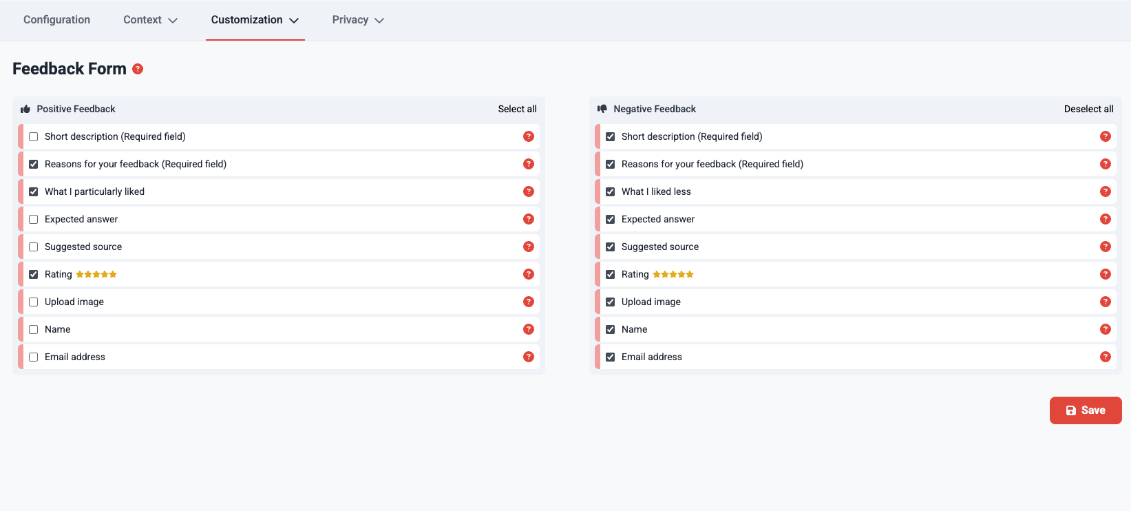 - You can choose between various fields for each positive and negative feedback.